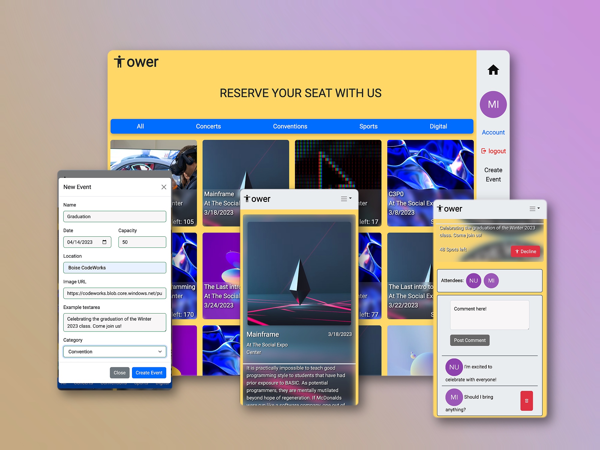 Tower is an application designed to help people get together with their towers of users for events. Whether they are concerts, expos, or sporting events, Tower will be there to get people together.