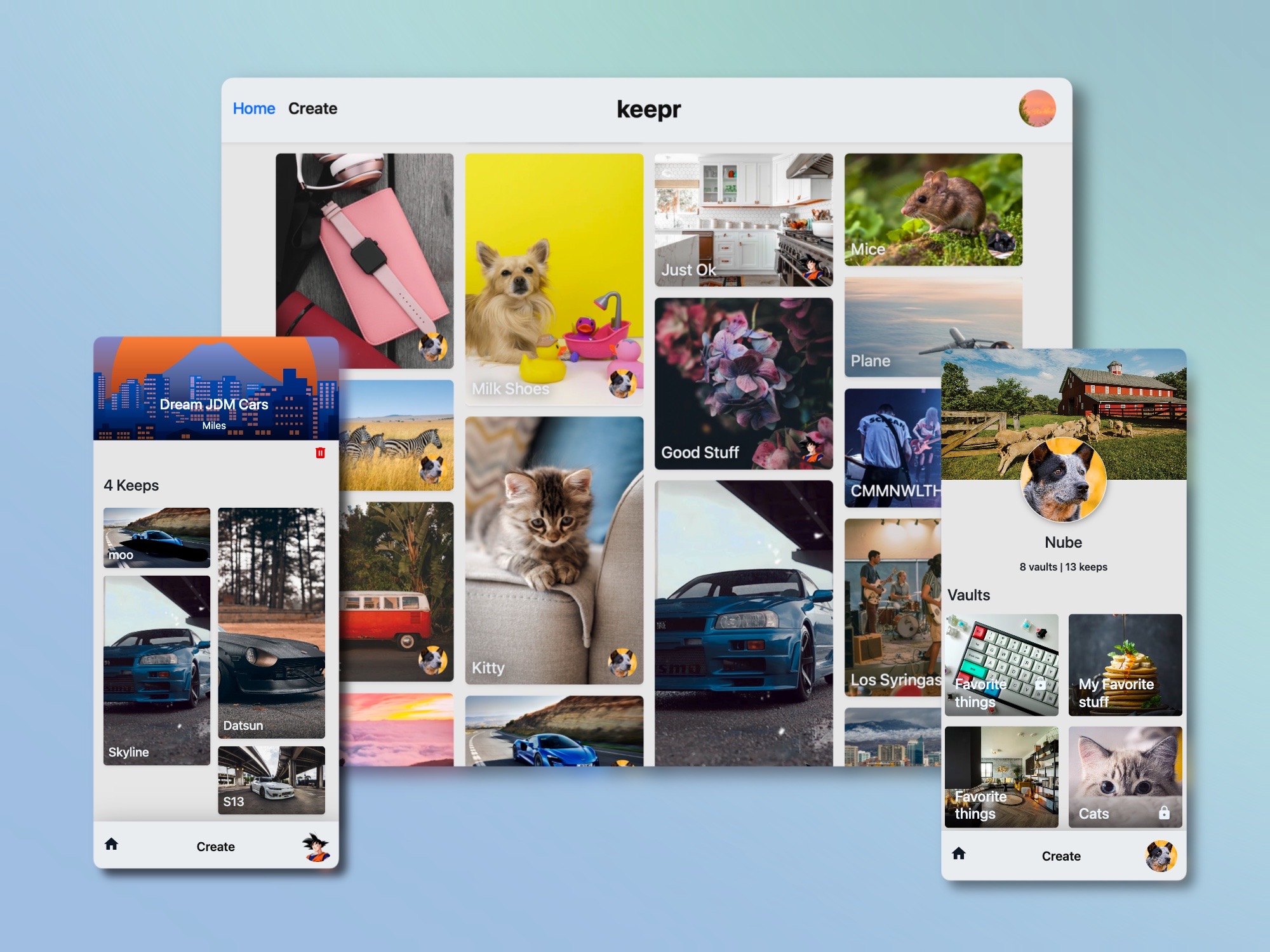 Keepr is a social network that allows users to visually share and discover new interests by posting images or videos to their own, or others', collections (i.e., a collection of 'vaults,' usually with a common theme) and browsing what other users have kept.